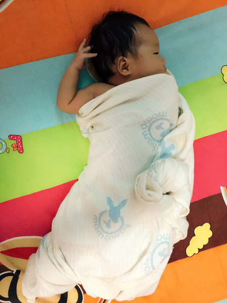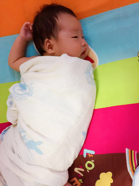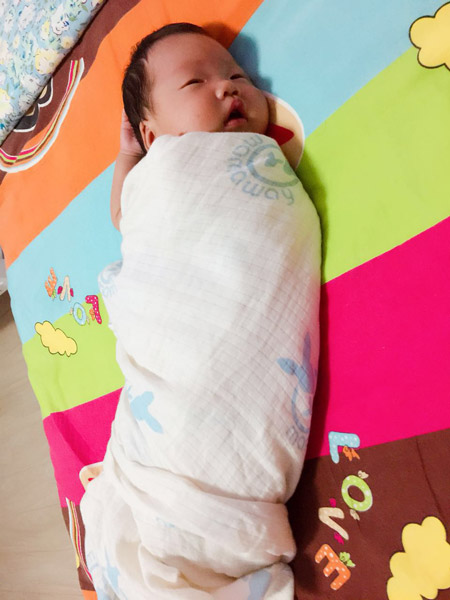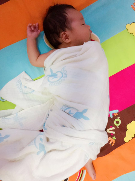 這一點非常重要哦,必須強調三遍,不含螢光劑,不含螢光劑,不含螢光劑!晚上就給寶寶用上了,9月初的北京早晚偏涼,中午又熱,所以必須有一款非常吸汗又透氣的紗布巾來滿足寶寶挑剔的需求,晚上可以疊兩到三層蓋在寶寶身上,白天單層即可,寶寶雖然自己不會表達,但相信這款紗布巾她用起來一定也很舒服,裹上後完全不哭鬧,我一開心,還給弄了個小造型
