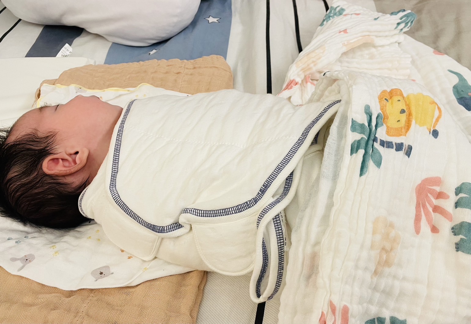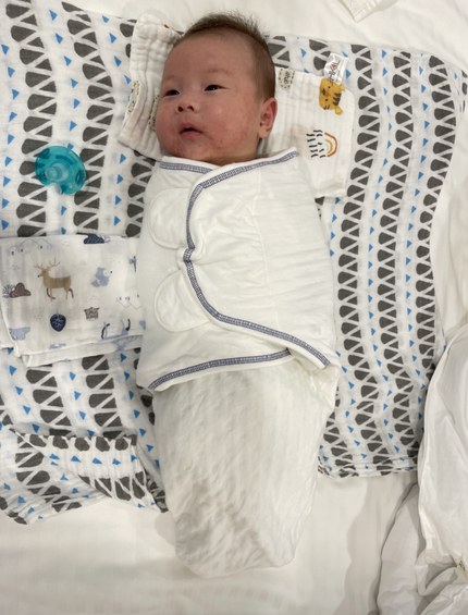 接收了朋友的恩典牌包巾後,寶寶睡眠品質提升很多,比較不會被自己嚇到大哭,也解決不會用毛巾包寶寶的問題,決定再來買一組替換,推薦給需要的媽媽們
