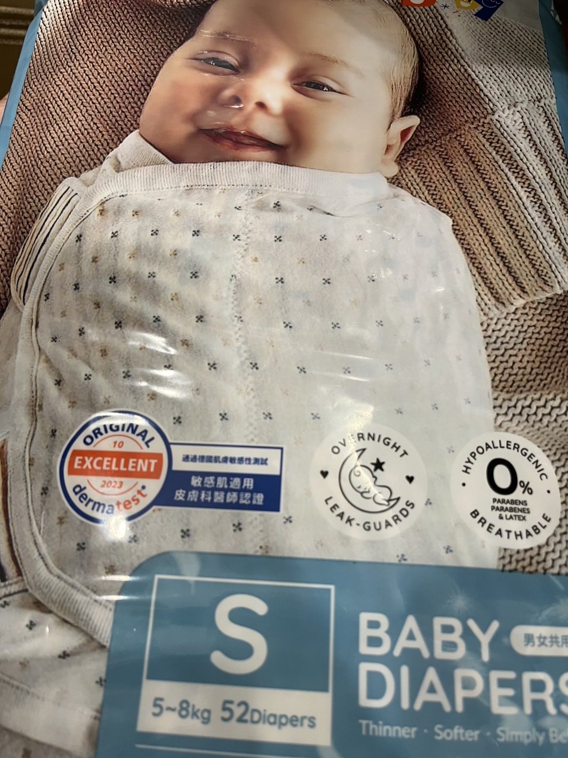 從新生兒NB系列用到S,北鼻怕熱又遇大熱天,mamaway的尿布標榜輕量透氣、高透氣防水表層、瞬吸不回滲,不像有些品牌,尿布超厚,超大一包感覺讓寶貝很不舒適,所以用mamaway到現在