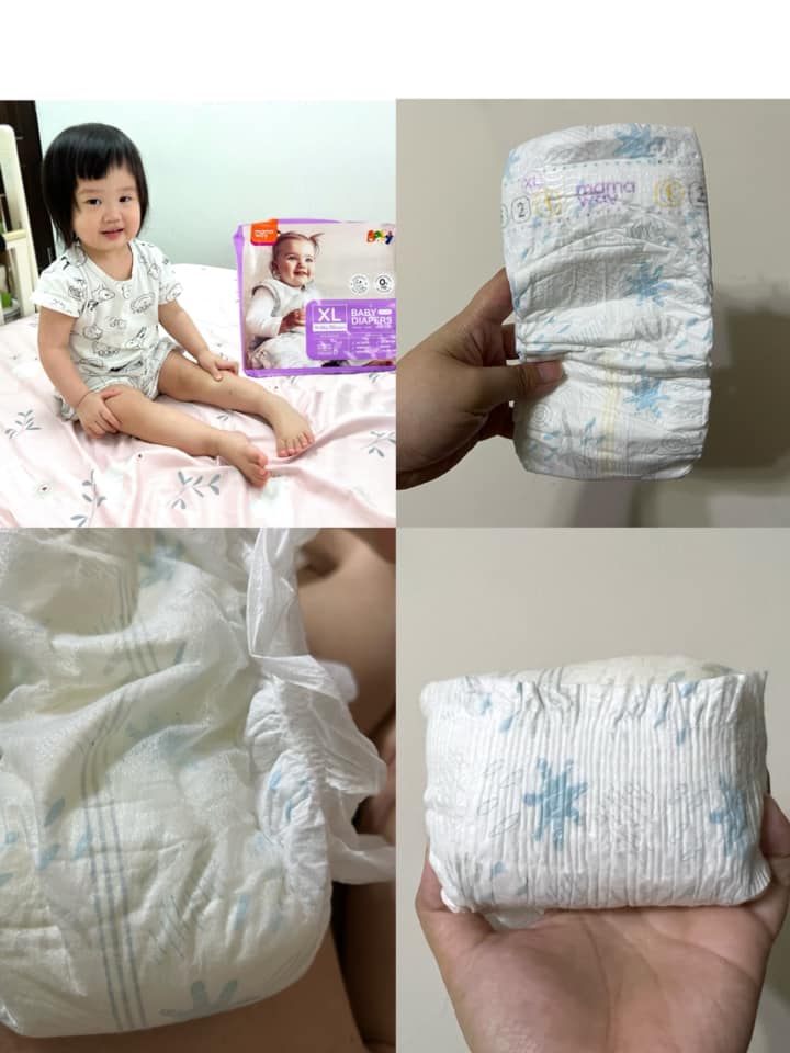 媽媽餵尿布很輕薄,疊起來不會厚重,腰圍鬆緊處彈性做的蠻大的,可以撐開使用,顯尿條有三條,方便辨識,尿布本身觸感蠻親膚的,吸收完尿液後,不會很大一包,也沒有很重的尿味。