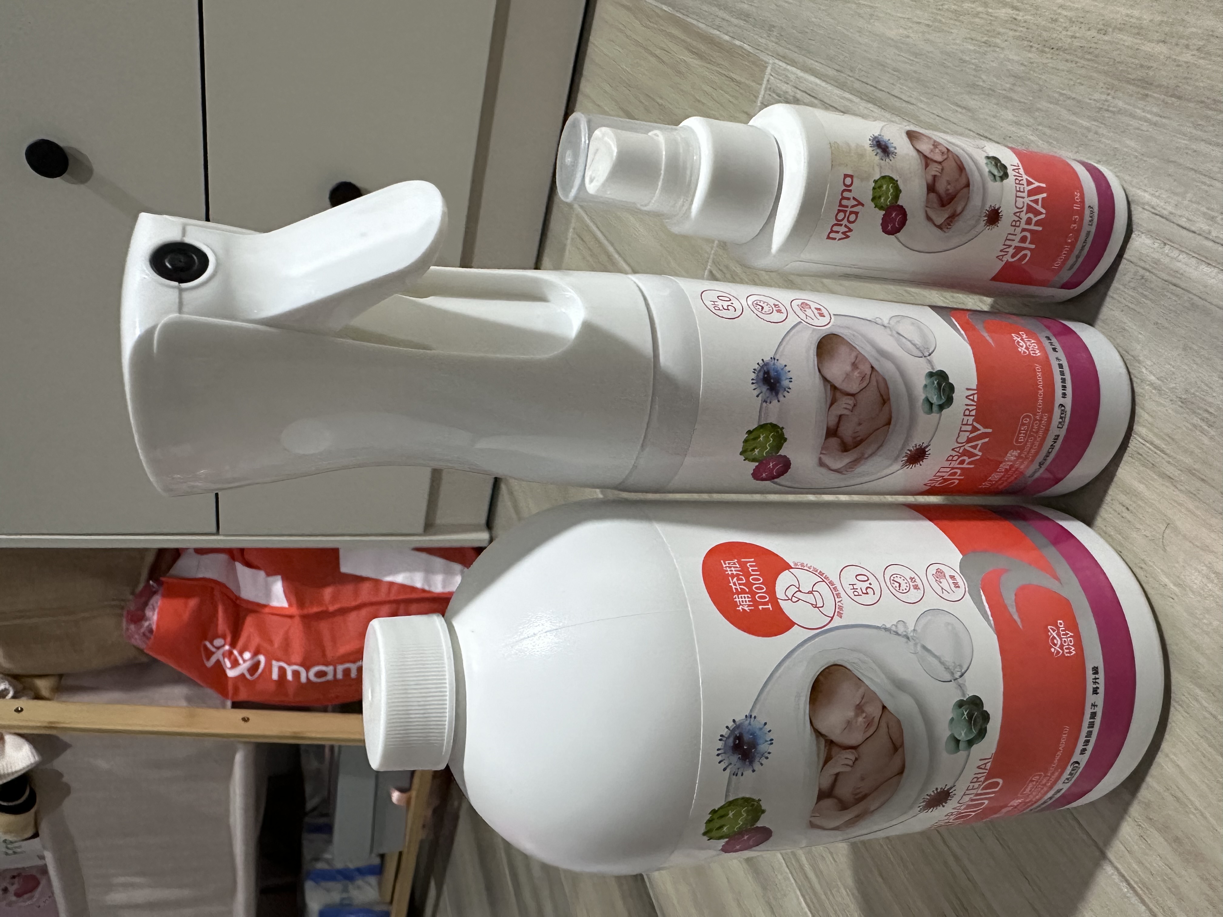 還有抗菌液,不論是家裡的玩具,或是地板我們也是常常都會用來消毒,出門也是必備品,寶寶在外面吃東西的餐桌椅及兒童餐具我們也都會用,甚至是寶寶本身要外出前我們也都會隔一點距離噴全身。