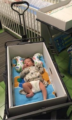有創意的爸媽將芬蘭床搖身一變,變成行動推車一小床,
